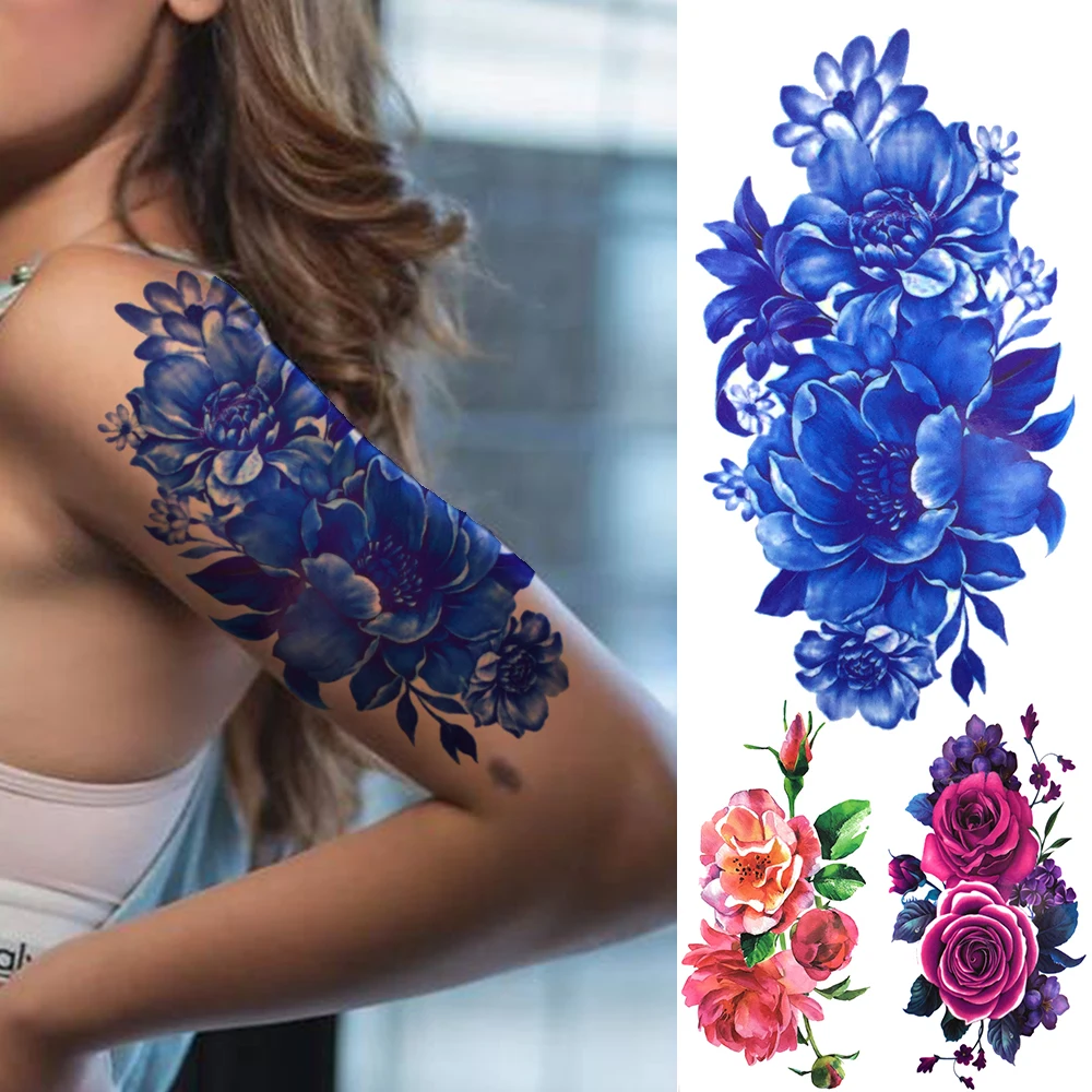 Blue Peony Temporary Tattoos For Women Men Children Realistic Rose Flower Lily Dahlia Tattoo Fake Sticker Water Transfer Tatoos